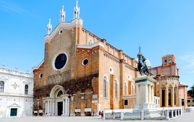 내부에는 역대 총독의 무덤이나 기념비, 16세기에 만들어진 무라노 섬제의 스테인드 글라스, 벨리니의 제단화, 벨로네제작의 「수태 고지」 「성모 피승천」 등의 그림이 있어, 베네치아의 놓칠 수 없다 관광 명소 중 하나라고 할 수 있습니다. 또, 교회전의 광장에는 르네상스 시대에 만들어진 벨로키오의 「콜레오 2기마대」가 있어, 이쪽도 놓칠 수 없는 작품입니다.