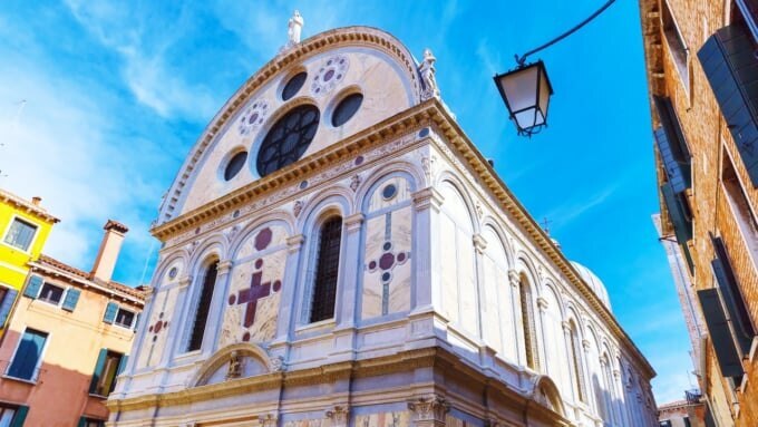 14세기에 재건된 대리석 장식이 멋진 고딕 건축 교회입니다. 벽돌의 외벽에는 발트로메오 본이 만든 대리석 조각이 장식되어 있으며, 내부 천장은 선 목수에 의해 선저 구조를 사용하여 나무로 만들어져 있습니다.