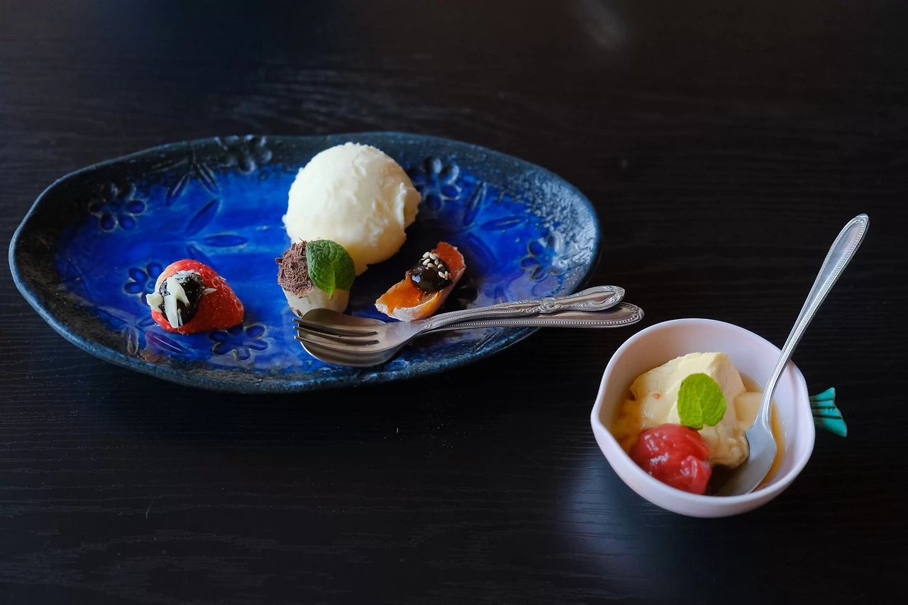 코반텐의 코스 메뉴에 곁들여지는 디저트 또한 독창적이고 맛있습니다. 바닐라 아이스크림에 과일과 핫초 된장을 곁들이거나, 방울토마토 콩포트에 흰 간장 푸딩을 곁들인 이 특별한 조합은 흰 간장의 도시 헤키난에서만 맛볼 수 있는 특별한 맛입니다. 이 아름답고 화려한 디저트들은 식사에 특별한 풍미를 더합니다.