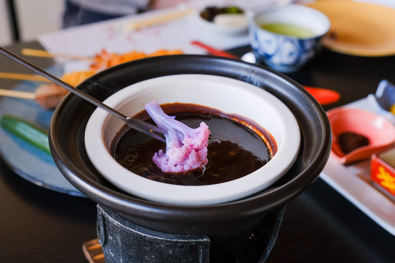 코반텐의 핫초 미소 퐁듀는 지역 특산 재료를 독창적인 방식으로 예술적으로 결합합니다. 구운 장어와 강렬한 풍미의 핫초 미소의 조화는 신선한 파와 어우러져 예상치 못한 맛을 선사합니다. 머스터드나 파마산 치즈를 살짝 뿌리면 요리의 풍미가 더욱 살아나 나고야 요리의 다채로운 면모와 셰프의 창의적인 접근 방식을 보여줍니다.